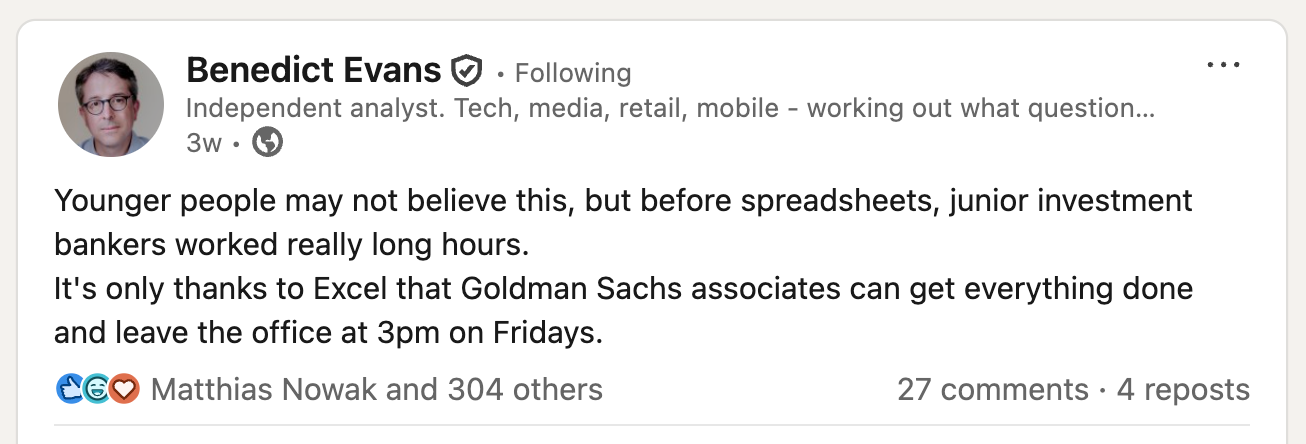 In der absehbaren Zukunft wird AI vor allem denjenigen helfen, die diese Fähigkeiten nutzen, klar von menschlichen Fähigkeiten abtrennen und ihre Prozesse teilweise rund um die Technologie umstrukturieren: Man formatiert Excel-Sheets anders, damit das Sprachmodell sie besser versteht. Man verschickt Angebote in neuen Formaten, weil das Sprachmodell diese robuster ausgibt.