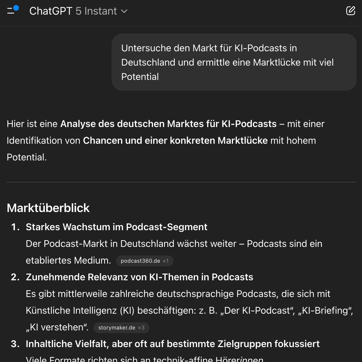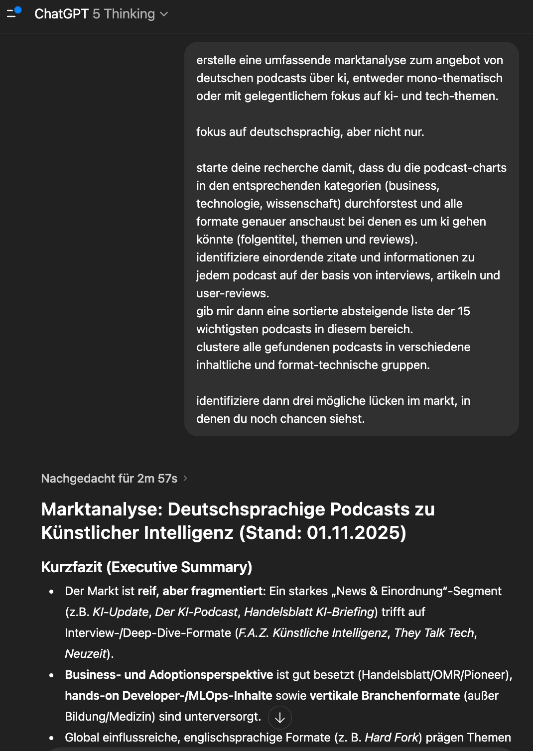 Man bekommt dieses Problem zum Teil dadurch in den Griff, dass man die richtigen Modelle einsetzt. Moderne “Reasoning”-Modelle wie GPT-5 Thinking sind deutlich besser darin, sich selbst zu hinterfragen und komplexeren Prozessen zu folgen. Auch die Frage nach der KI-Podcast-Marktlücke beantwortet GPT-5 Thinking mit einem guten Prompt sehr viel vernünftiger als seine Nicht-Reasoning-Schwester im Screenshot weiter oben (Link zur ganzen Antwort):
