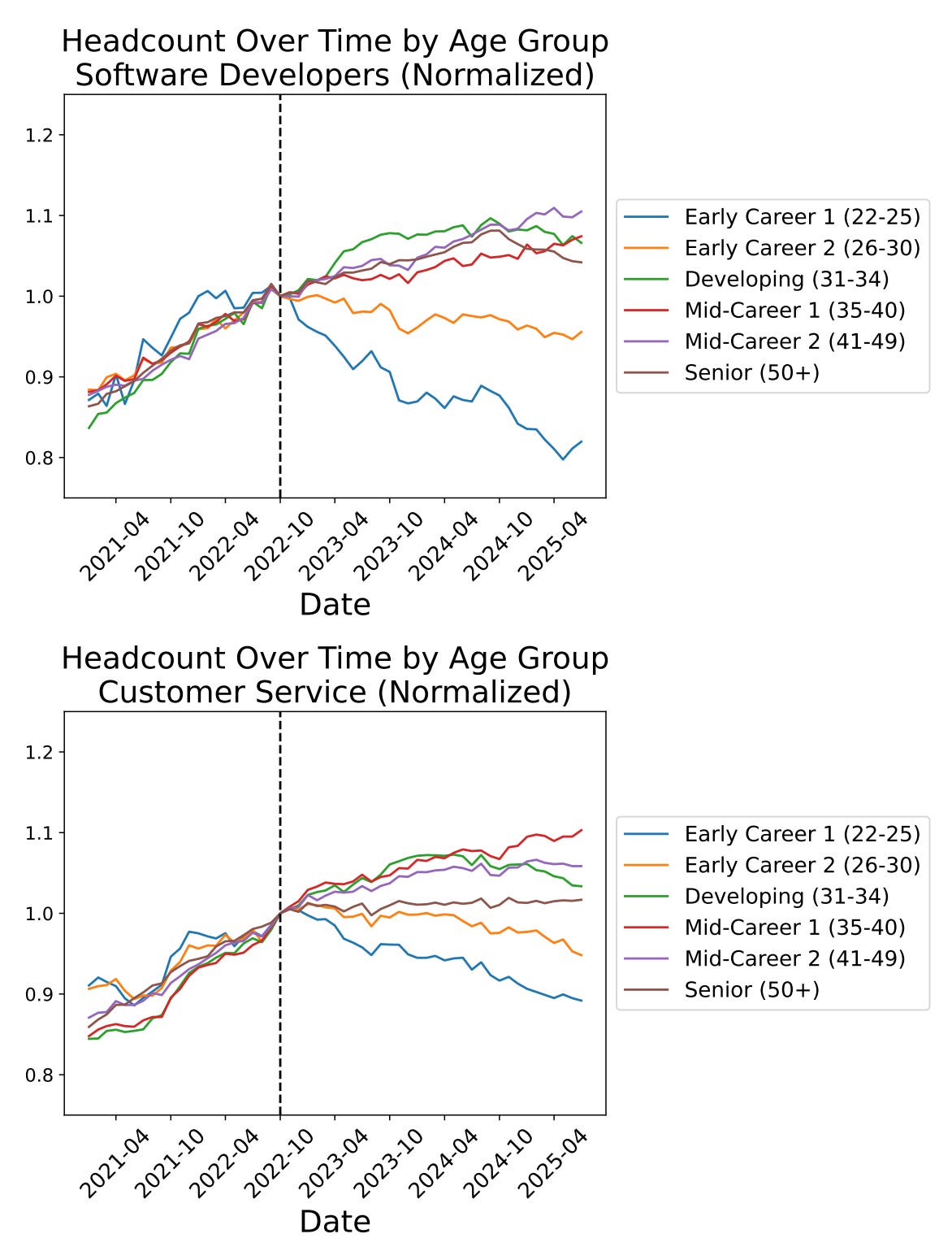 Die erste Studie ist ein frisch veröffentlichtes Working Paper des Stanford Digital Economy Lab namens “Canaries in the Coal Mine”, unter Leitung von Ökonom Erik Brynjolfsson. Der Blockbuster-Satz in der Untersuchung ist dieser hier: