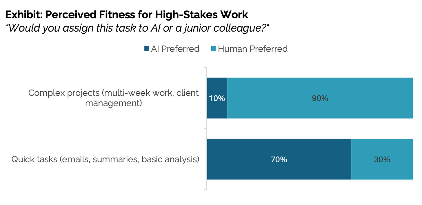 In der Theorie passt das zusammen: AI ist sehr gut im Zusammenfassen und Durchforsten langer Dokumente, im Abfassen von Protokollen und Briefings, sowie in Internet-Recherchen und dem Abgleichen von Datensätzen. Viel gemein haben diese Aufgaben nicht, außer dass es genau die sind, die in vielen Unternehmen von Werkstudenten und Juniors übernommen werden.