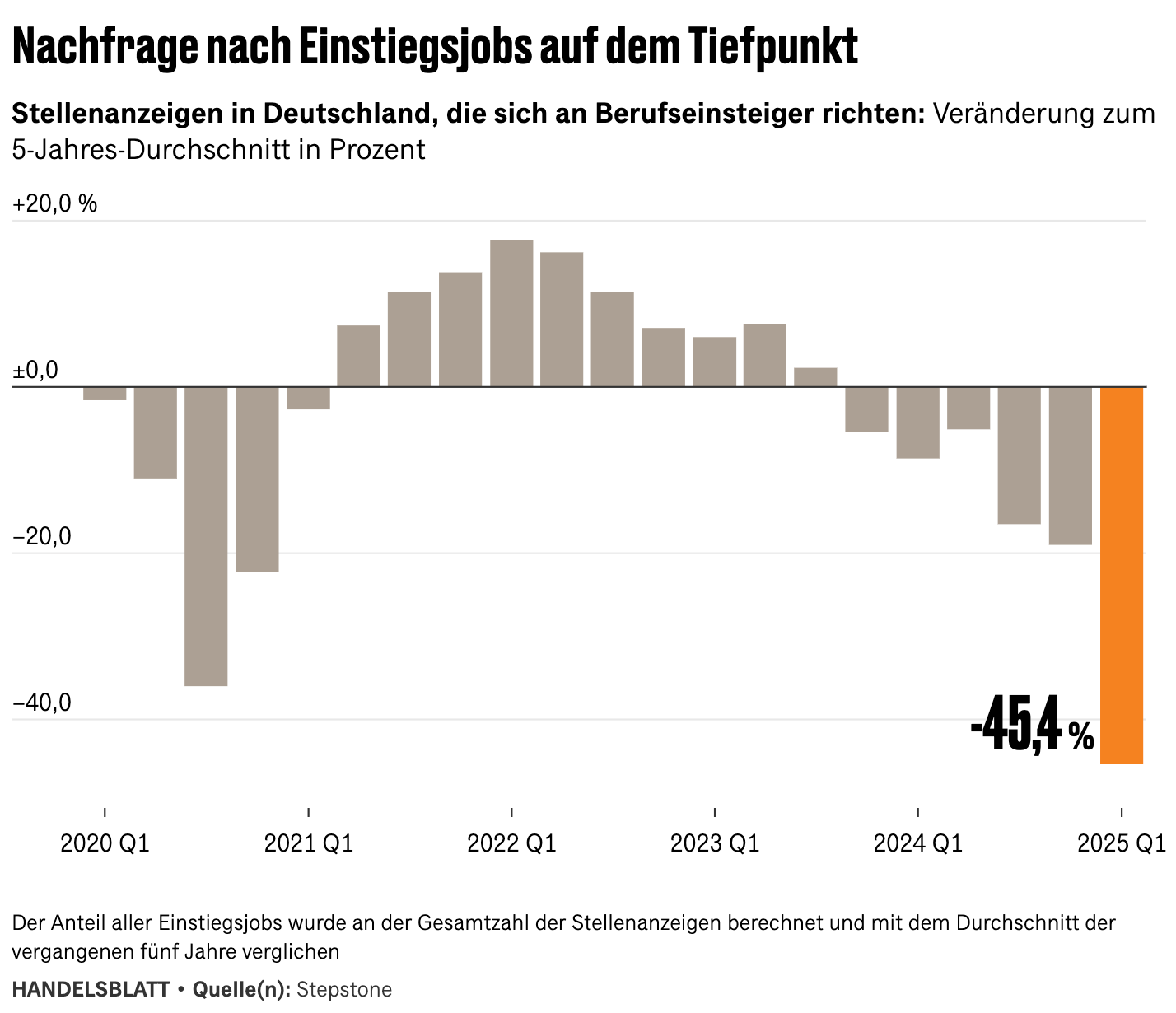 Vor zwei Wochen zeigte das Handelsblatt in Zusammenarbeit mit Stepstone auf, dass auch auf dem deutschen Arbeitsmarkt ähnliches los ist: die Zahl der ausgeschriebenen Einsteigerjobs ist seit Beginn des AI-Booms massiv abgefallen.
