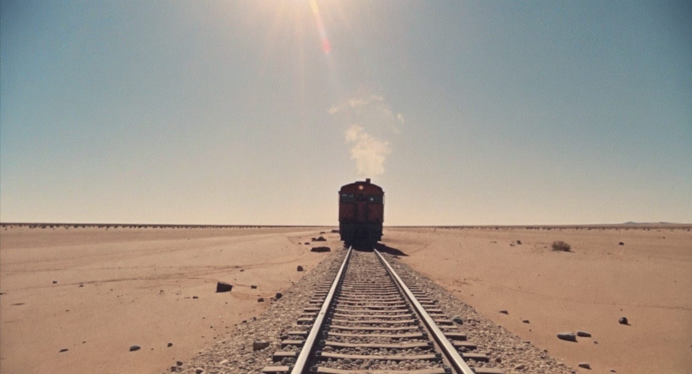 Der Zug fährt durch weitläufige Wüste. Draußen nur flimmernde, unmarkierte Luft.