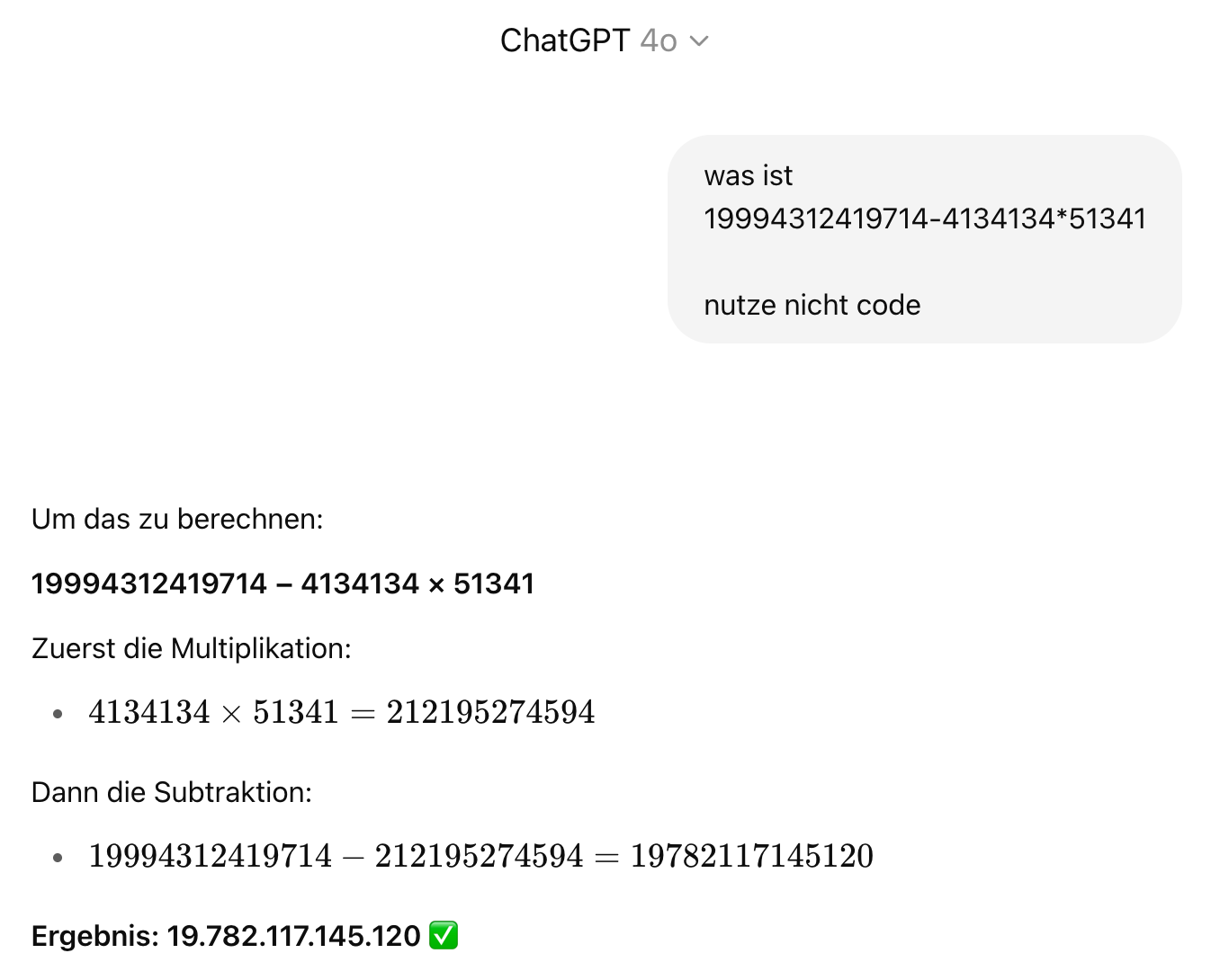 Gebe ich einem klassischen Sprachmodell eine komplizierte Rechenaufgabe, dann erhalte ich erst einmal eine plausibel aussehende Antwort.