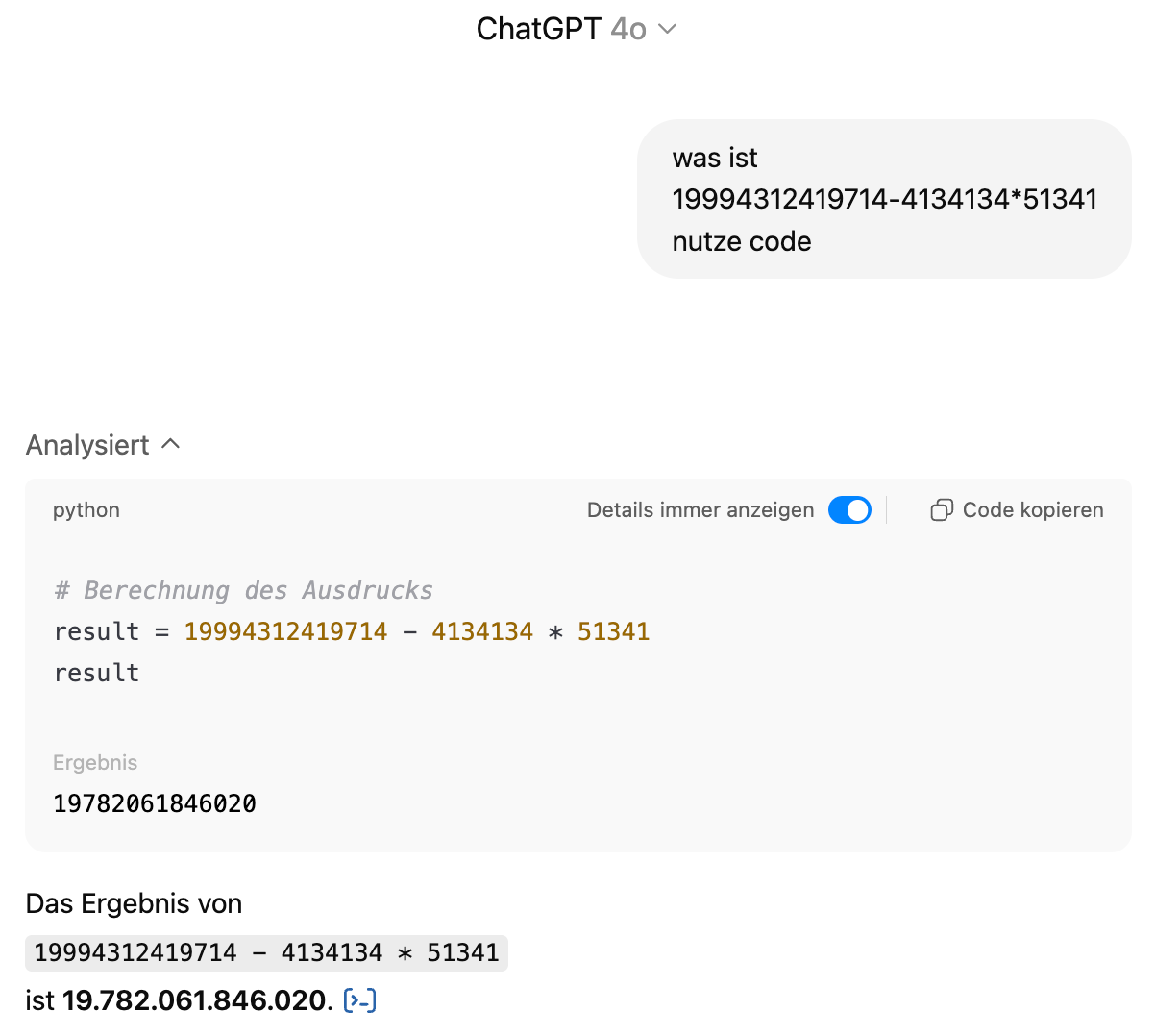 Was ist hier passiert? Anstatt selbst die Antwort zu raten, hat das Modell einen kleinen Python-Code geschrieben und sich das Ergebnis ausrechnen lassen. Und schon kommt sie zum richtigen Ergebnis.