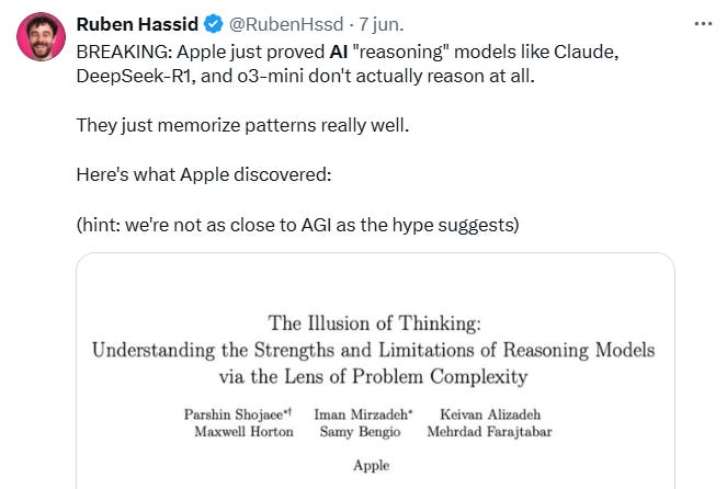 Critique of Pure Reasoning Models. Weiterer interessanter Take zu Apples Reasoning-Paper. learningfromexamples.com