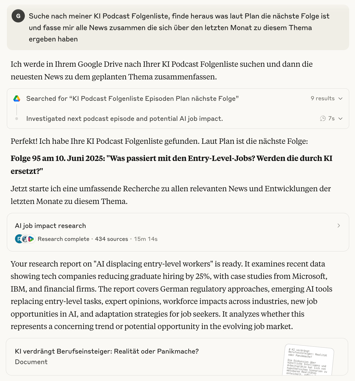 In diesem Beispiel habe ich testweise eine Folgenliste für Der KI-Podcast in meinem Google Drive abgespeichert und Claude anschließend die Aufgabe gegeben, nach der Liste zu suchen, das Thema der nächsten Folge ausfindig zu machen, und mir einen Bericht zusammenzustellen, der als Startpunkt für die Recherche dienen kann.