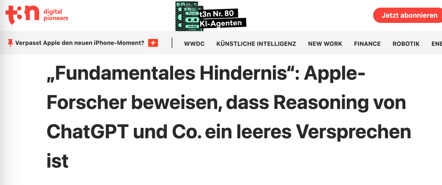 All das führt uns zu Generative AI. Und zu dem Paper “The Illusion of Thinking”, mit dem Apples Forschungsabteilung in den letzten zwei Wochen einen medialen Feuersturm losgetreten hat.