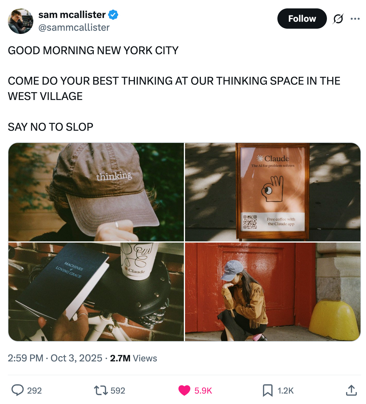 Anfang des Monats eröffnete Anthropic einen Pop-Up-Store in New York. Es gab gratis Caps, Bücher und Kaffee. Die Aktion – hier charmant nacherzählt von Anthropic-Mitarbeiter Sam McAllister – war ein Riesenerfolg.