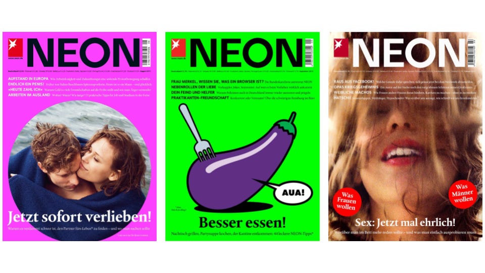 Die NEON (das muss man heute wohl leider erklären) war eine Millennial-Zeitschrift der 00er und frühen 10er-Jahre, bekannt für ihre Reportagen, Popkulturbeobachtungen und die “Unnützes Wissen”-Rubrik. Den Sprung ins Digitale Anfang der 2010er-Jahre bekam sie nie richtig hin. Die NEON starb. Heute taugt die Marke nur noch als Nostalgie-Thema bei Brunch-Gesprächen.
