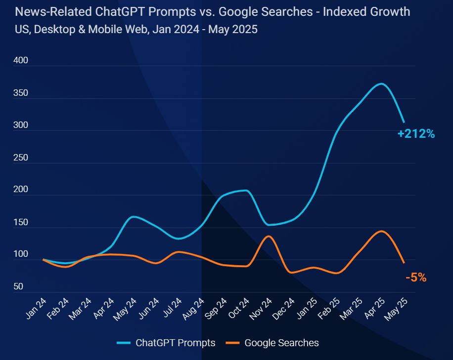 Wie SimilarWeb zeigt, suchen immer mehr Menschen mittlerweile über ChatGPT nach Nachrichten, die Zahl der Google-Anfragen bleibt flach.