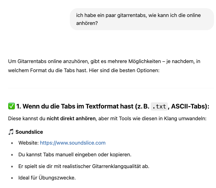 Denn obwohl Soundslice die Funktion “Gitarren-Tabs hochladen” nicht unterstützte… ChatGPT behauptete das Gegenteil:
