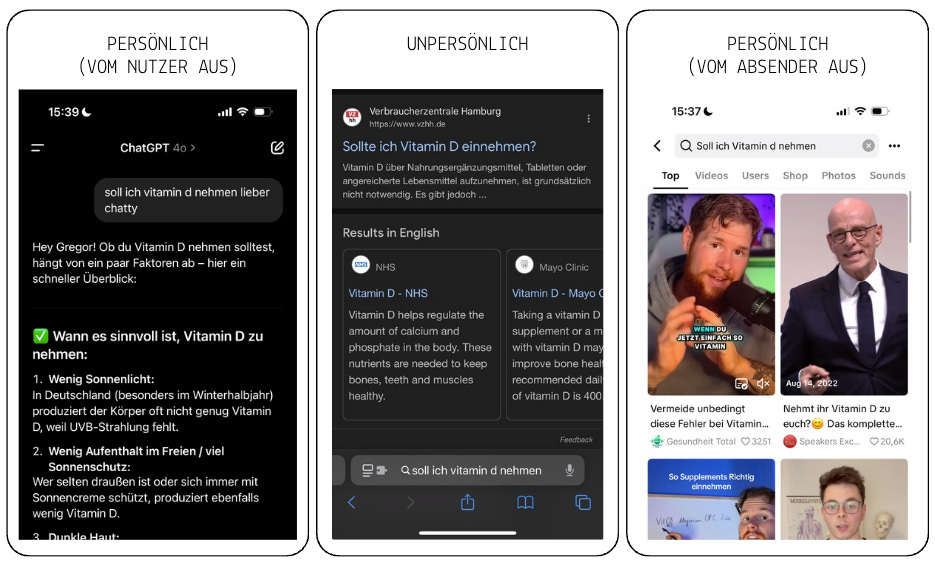 TikTok erscheint persönlich, weil einem dort Influencer vorgaukeln, sie seien meine Freunde und könnten mir die perfekte Nahrungsergänzungsmittelkur empfehlen. Und ChatGPT erscheint persönlich, weil die AI sich viele kleine Datenpunkte über mich gemerkt hat und auf persönliche, direkte und natürliche Art und Weise antworten kann. Klassische Websites haben dagegen kaum noch eine Chance.